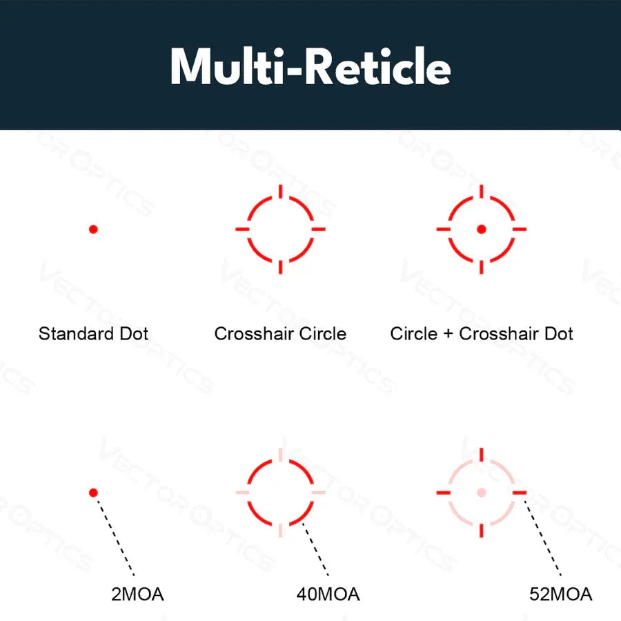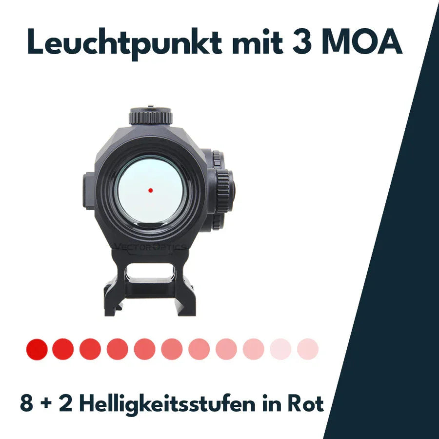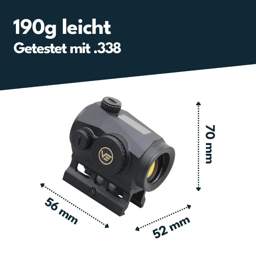 Той предлага и три избираеми прицела, сензор за движение (автоматично изключване след 2 минути неактивност, и се включва отново веднага щом оптиката бъде преместена), както и общо десет нива на яркост (включително 2 нива за нощно виждане).
